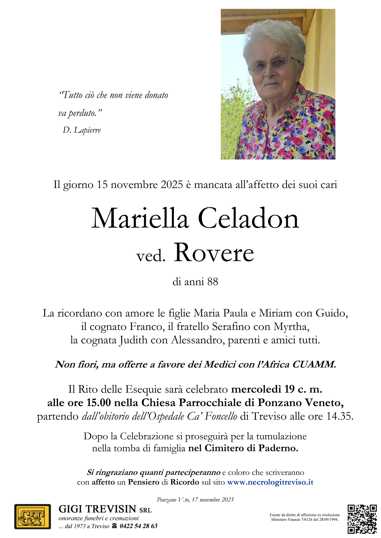 Non fiori, ma offerte a favore dei Medici con l’Africa CUAMM.