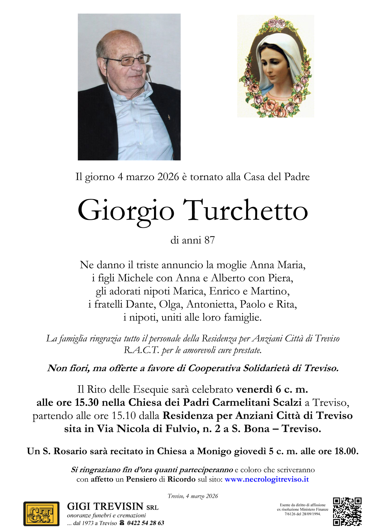 Non fiori, ma offerte a favore di Cooperativa Solidarietà di Treviso.
